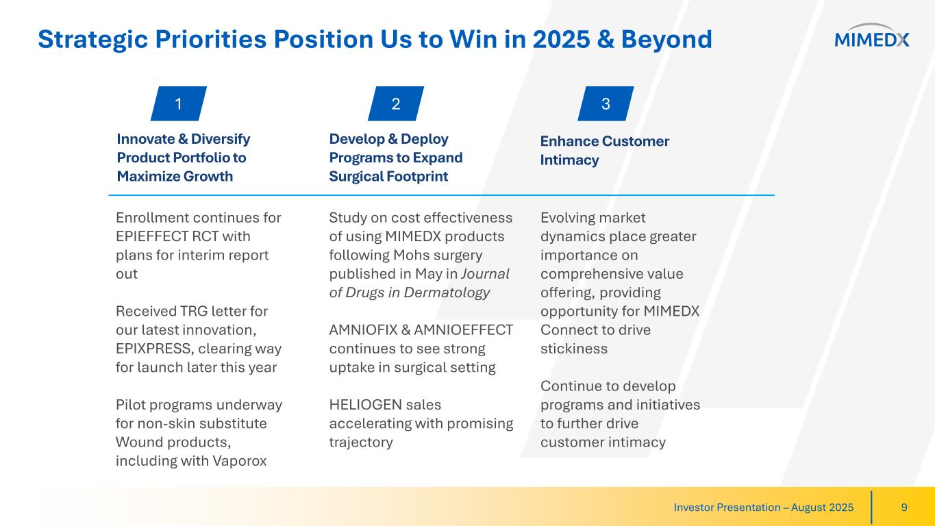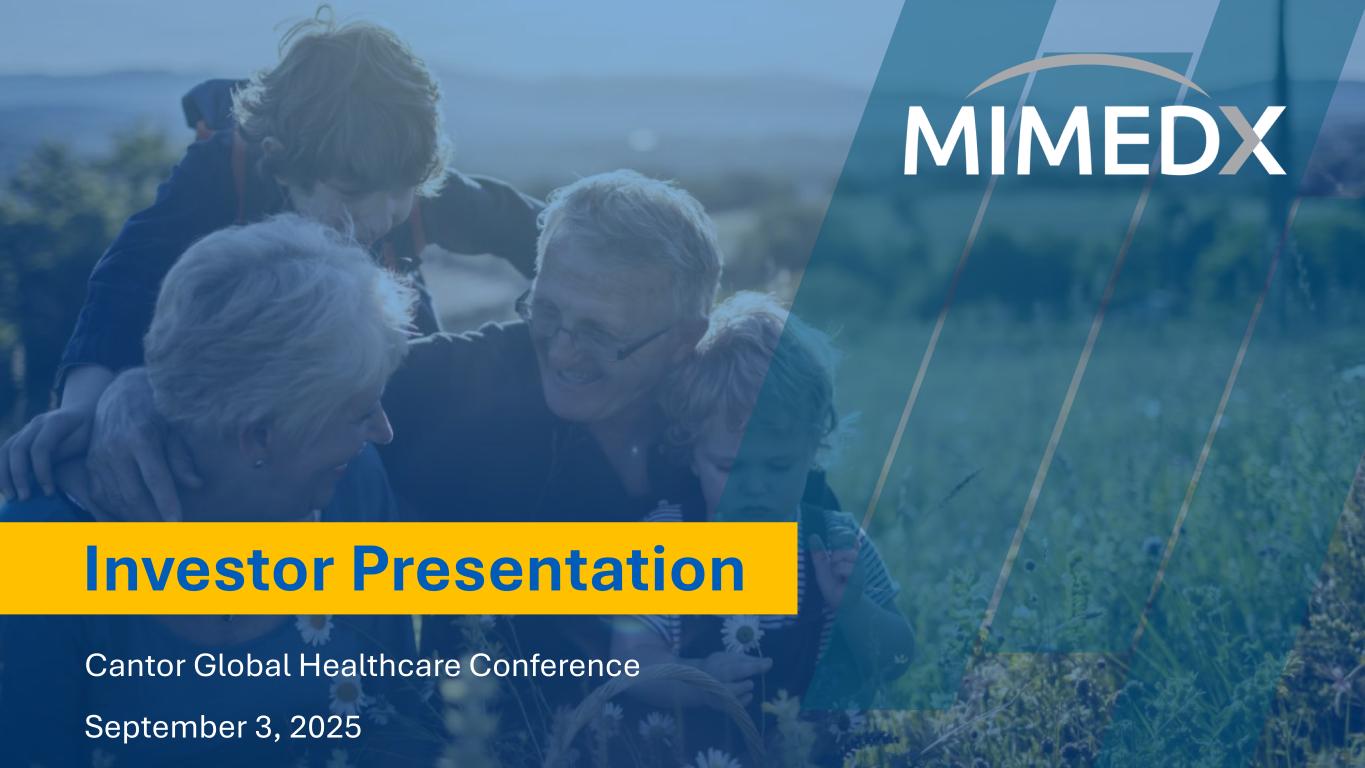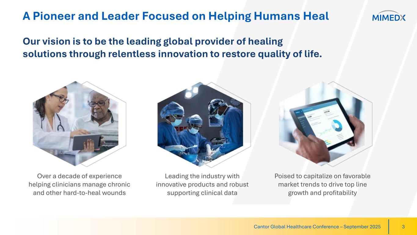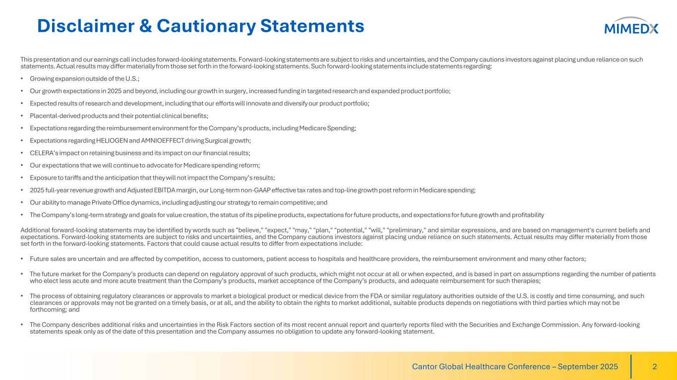 Disclaimer & Cautionary Statements This presentation and our earnings call includes forward-looking statements. Forward-looking statements are subject to risks and uncertainties, and the Company cautions investors against placing undue reliance on such statements. Actual results may differ materially from those set forth in the forward-looking statements. Such forward-looking statements include statements regarding: • Growing expansion outside of the U.S.; • Our growth expectations in 2025 and beyond, including our growth in surgery, increased funding in targeted research and expanded product portfolio; • Expected results of research and development, including that our efforts will innovate and diversify our product portfolio; • Placental-derived products and their potential clinical benefits; • Expectations regarding the reimbursement environment for the Company’s products, including Medicare Spending; • Expectations regarding HELIOGEN and AMNIOEFFECT driving Surgical growth; • CELERA’s impact on retaining business and its impact on our financial results; • Our expectations that we will continue to advocate for Medicare spending reform; • Exposure to tariffs and the anticipation that they will not impact the Company’s results; • 2025 full-year revenue growth and Adjusted EBITDA margin, our Long-term non-GAAP effective tax rates and top-line growth post reform in Medicare spending; • Our ability to manage Private Office dynamics, including adjusting our strategy to remain competitive; and • The Company’s long-term strategy and goals for value creation, the status of its pipeline products, expectations for future products, and expectations for future growth and profitability Additional forward-looking statements may be identified by words such as "believe," "expect," "may," "plan," "potential," "will," "preliminary," and similar expressions, and are based on management's current beliefs and expectations. Forward-looking statements are subject to risks and uncertainties, and the Company cautions investors against placing undue reliance on such statements. Actual results may differ materially from those set forth in the forward-looking statements. Factors that could cause actual results to differ from expectations include: • Future sales are uncertain and are affected by competition, access to customers, patient access to hospitals and healthcare providers, the reimbursement environment and many other factors; • The future market for the Company’s products can depend on regulatory approval of such products, which might not occur at all or when expected, and is based in part on assumptions regarding the number of patients who elect less acute and more acute treatment than the Company’s products, market acceptance of the Company’s products, and adequate reimbursement for such therapies; • The process of obtaining regulatory clearances or approvals to market a biological product or medical device from the FDA or similar regulatory authorities outside of the U.S. is costly and time consuming, and such clearances or approvals may not be granted on a timely basis, or at all, and the ability to obtain the rights to market additional, suitable products depends on negotiations with third parties which may not be forthcoming; and • The Company describes additional risks and uncertainties in the Risk Factors section of its most recent annual report and quarterly reports filed with the Securities and Exchange Commission. Any forward-looking statements speak only as of the date of this presentation and the Company assumes no obligation to update any forward-looking statement. Cantor Global Healthcare Conference – September 2025 2