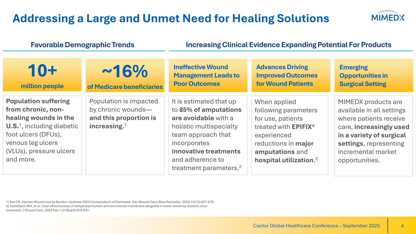 A Pioneer and Leader Focused on Helping Humans Heal Cantor Global Healthcare Conference – September 2025 3 Over a decade of experience helping clinicians manage chronic and other hard-to-heal wounds Leading the industry with innovative products and robust supporting clinical data Poised to capitalize on favorable market trends to drive top line growth and profitability Our vision is to be the leading global provider of healing solutions through relentless innovation to restore quality of life.