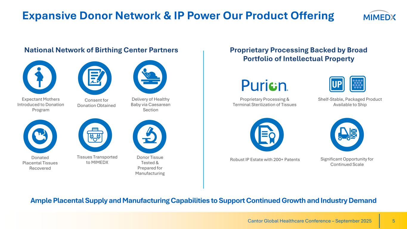 Addressing a Large and Unmet Need for Healing Solutions Cantor Global Healthcare Conference – September 2025 4 Favorable Demographic Trends Increasing Clinical Evidence Expanding Potential For Products 1) Sen CK. Human Wound and Its Burden: Updated 2022 Compendium of Estimates. Adv Wound Care (New Rochelle). 2023;12(12):657-670. 2) Tettelbach WH, et al. Cost-effectiveness of dehydrated human amnion/chorion membrane allografts in lower extremity diabetic ulcer treatment. J Wound Care. 2022 Feb 1;31(Sup2):S10-S31. Ineffective Wound Management Leads to Poor Outcomes When applied following parameters for use, patients treated with EPIFIX® experienced reductions in major amputations and hospital utilization.2 It is estimated that up to 85% of amputations are avoidable with a holistic multispecialty team approach that incorporates innovative treatments and adherence to treatment parameters.2 Population suffering from chronic, non- healing wounds in the U.S.1, including diabetic foot ulcers (DFUs), venous leg ulcers (VLUs), pressure ulcers and more. Population is impacted by chronic wounds— and this proportion is increasing.1 Advances Driving Improved Outcomes for Wound Patients Emerging Opportunities in Surgical Setting MIMEDX products are available in all settings where patients receive care, increasingly used in a variety of surgical settings, representing incremental market opportunities. 10+ million people ~16% of Medicare beneficiaries