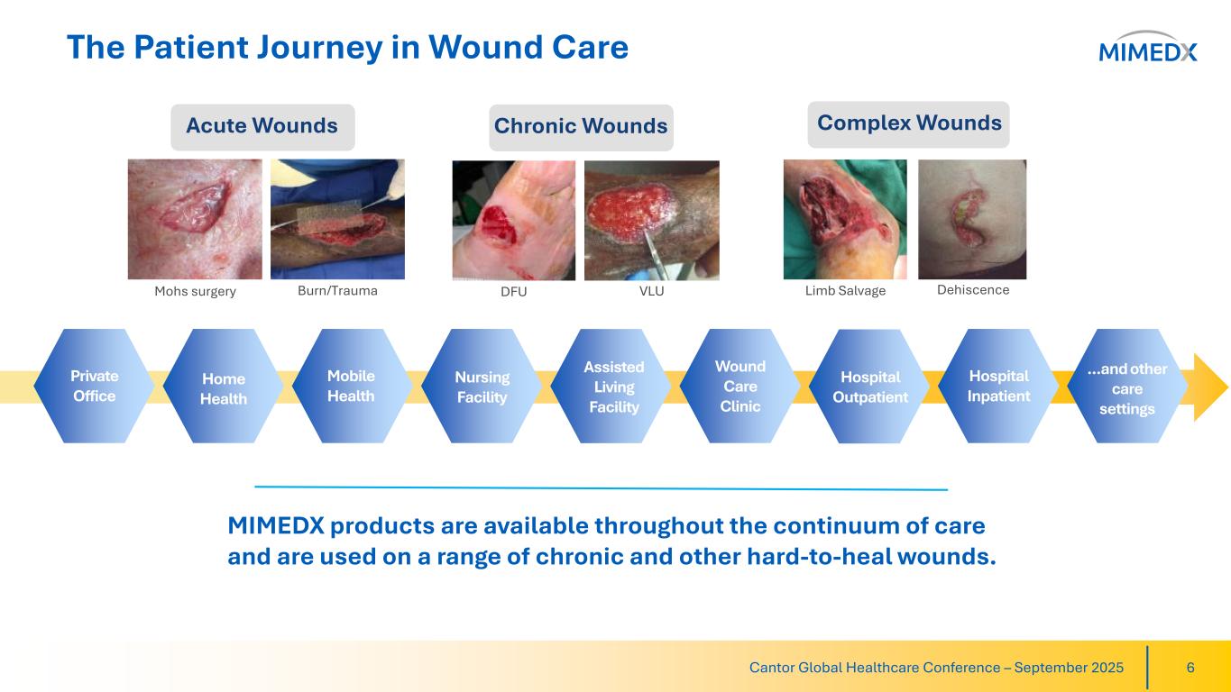 Expansive Donor Network & IP Power Our Product Offering 5Cantor Global Healthcare Conference – September 2025 National Network of Birthing Center Partners Ample Placental Supply and Manufacturing Capabilities to Support Continued Growth and Industry Demand Expectant Mothers Introduced to Donation Program Consent for Donation Obtained Delivery of Healthy Baby via Caesarean Section Donated Placental Tissues Recovered Tissues Transported to MIMEDX Donor Tissue Tested & Prepared for Manufacturing Proprietary Processing Backed by Broad Portfolio of Intellectual Property Proprietary Processing & Terminal Sterilization of Tissues Shelf-Stable, Packaged Product Available to Ship Robust IP Estate with 200+ Patents Significant Opportunity for Continued Scale