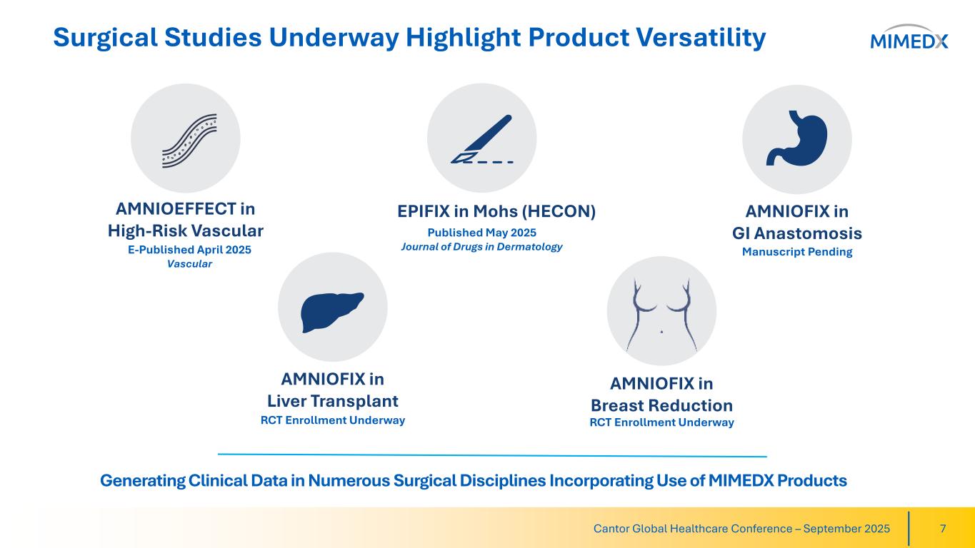 The Patient Journey in Wound Care 6Cantor Global Healthcare Conference – September 2025 Private Office Home Health Mobile Health Nursing Facility Assisted Living Facility Wound Care Clinic Hospital Outpatient Hospital Inpatient …and other care settings Mohs surgery Burn/Trauma DFU VLU Limb Salvage Dehiscence Acute Wounds Chronic Wounds Complex Wounds MIMEDX products are available throughout the continuum of care and are used on a range of chronic and other hard-to-heal wounds.
