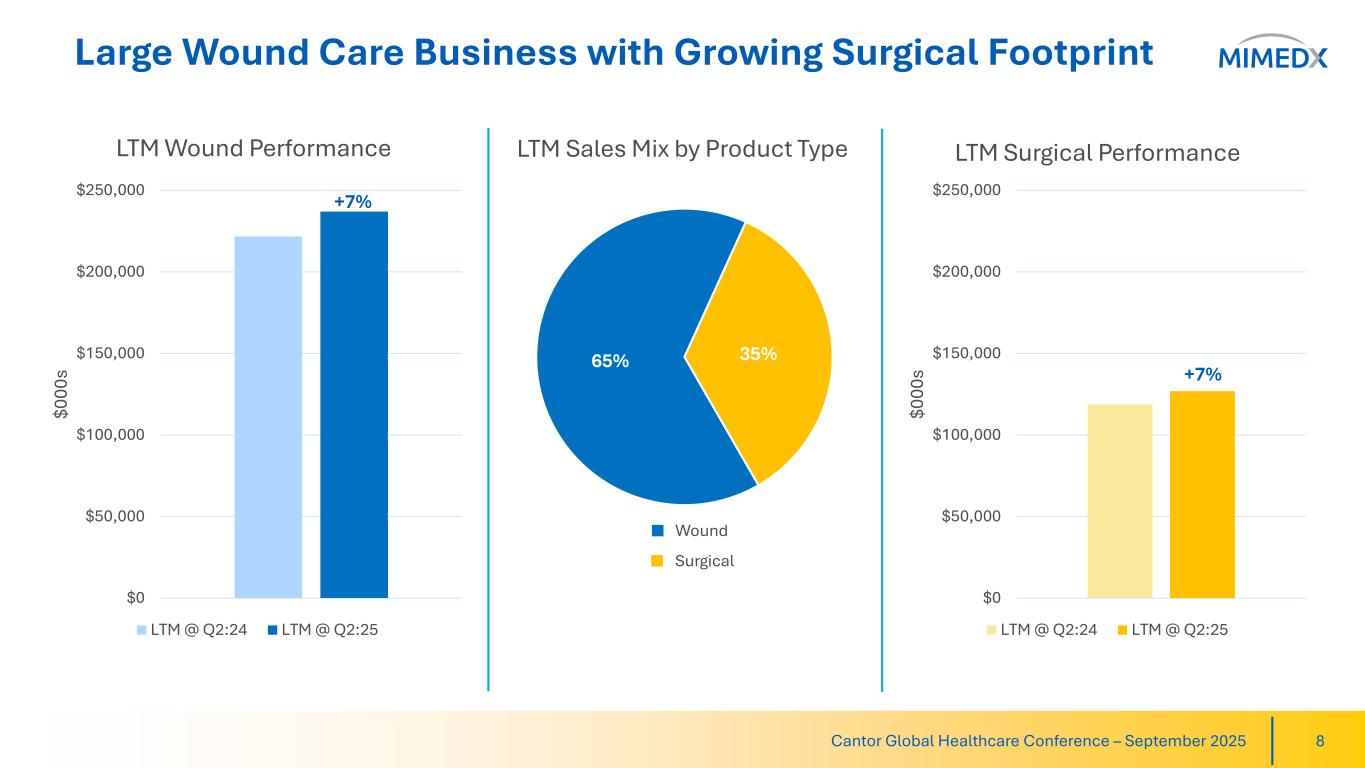Surgical Studies Underway Highlight Product Versatility 7Cantor Global Healthcare Conference – September 2025 Published May 2025 Journal of Drugs in Dermatology Manuscript Pending RCT Enrollment Underway RCT Enrollment Underway Generating Clinical Data in Numerous Surgical Disciplines Incorporating Use of MIMEDX Products EPIFIX in Mohs (HECON) AMNIOFIX in GI Anastomosis AMNIOFIX in Liver Transplant AMNIOFIX in Breast Reduction AMNIOEFFECT in High-Risk Vascular E-Published April 2025 Vascular