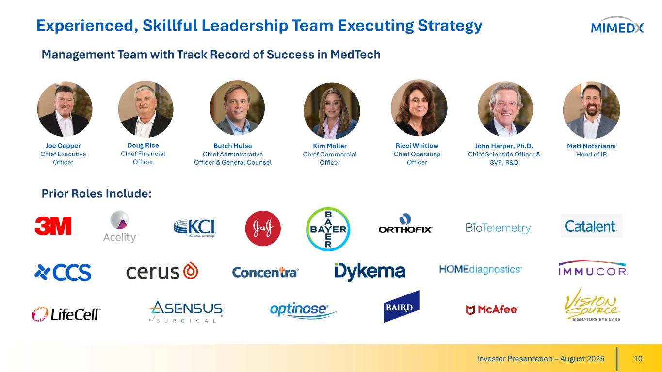 Strategic Priorities Position Us to Win in 2025 & Beyond Investor Presentation – August 2025 9 Innovate & Diversify Product Portfolio to Maximize Growth Develop & Deploy Programs to Expand Surgical Footprint Enhance Customer Intimacy Enrollment continues for EPIEFFECT RCT with plans for interim report out Received TRG letter for our latest innovation, EPIXPRESS, clearing way for launch later this year Pilot programs underway for non-skin substitute Wound products, including with Vaporox Study on cost effectiveness of using MIMEDX products following Mohs surgery published in May in Journal of Drugs in Dermatology AMNIOFIX & AMNIOEFFECT continues to see strong uptake in surgical setting HELIOGEN sales accelerating with promising trajectory Evolving market dynamics place greater importance on comprehensive value offering, providing opportunity for MIMEDX Connect to drive stickiness Continue to develop programs and initiatives to further drive customer intimacy 1 2 3